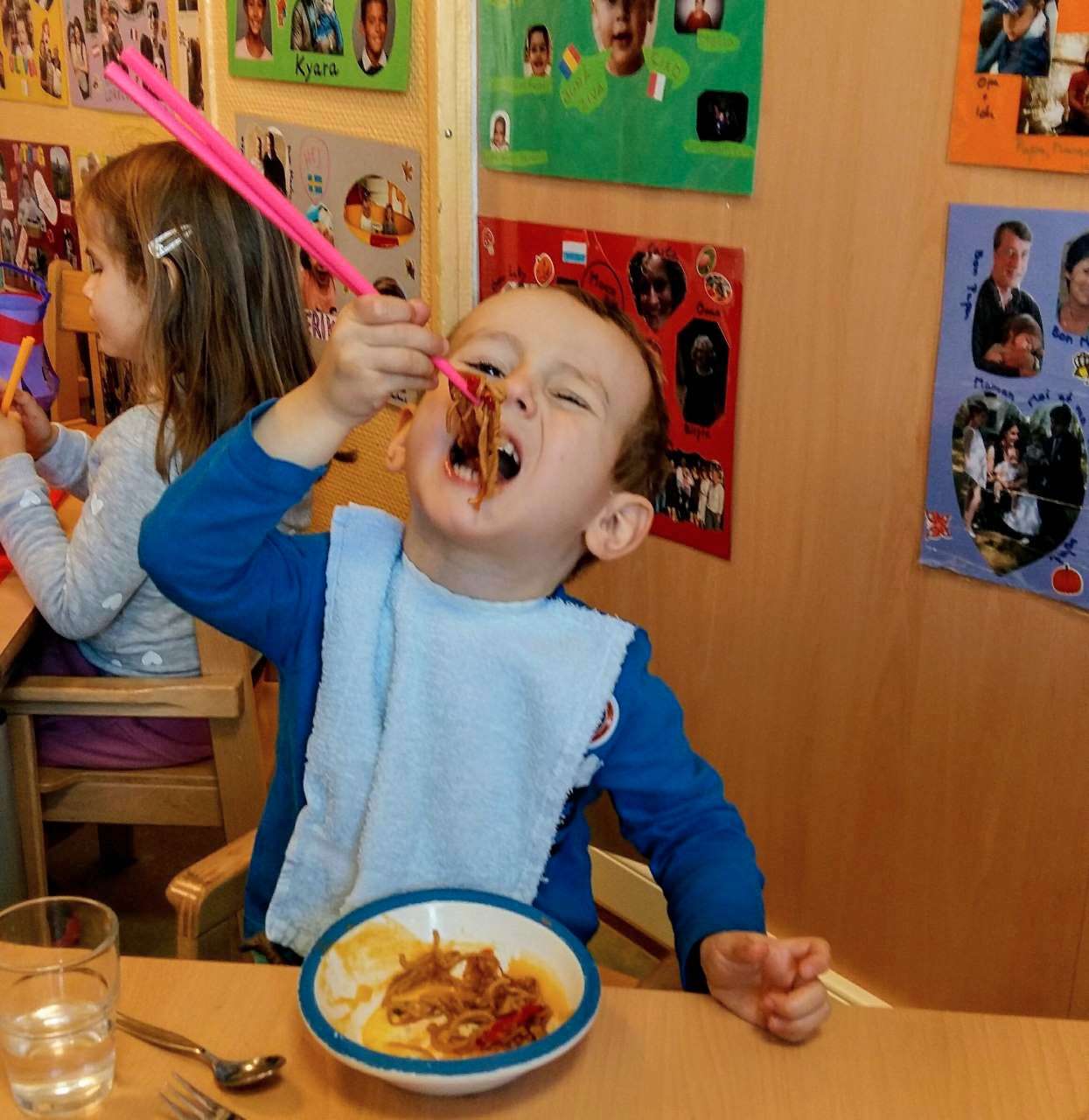 Au menu les enfants ont dégusté des nouilles de riz, sautées aux légumes et ont essayé de manger avec des baguettes !!!!