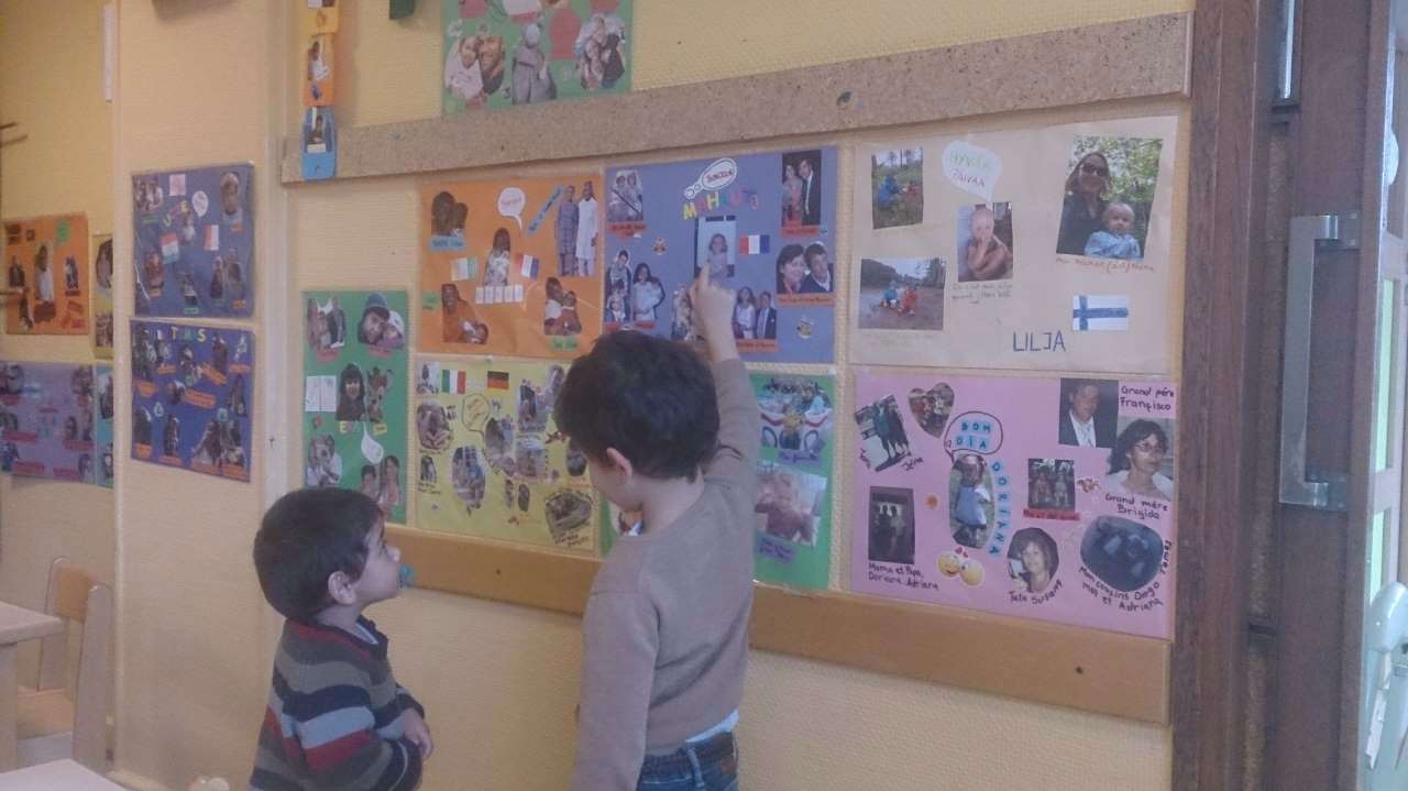 Les affiches du mur des familles, constituées par les photos que les familles ont ramenées, resteront visibles et à hauteur des enfants en permanence (ce n'est que lorsqu'un enfant quitte définitivement le jardin d'enfant qu'on lui remet son affiche). Elles constituent un carrefour d’échanges, les enfants étant fiers de se retrouver autour du mur pour parler à leurs camarades, de leur famille.