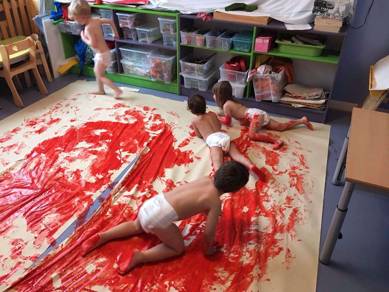 Tout d'abord, nous savons que pour les 3-4 ans, s'exprimer artistiquement est fortement recommandé sur les papiers « grand format ». On peut dire qu'ils avaient de quoi faire avec un sol entièrement recouvert de papier ! (astuce, utilisons des rouleaux de tapisserie, plus épais (donc plus résistant), et très économique!)