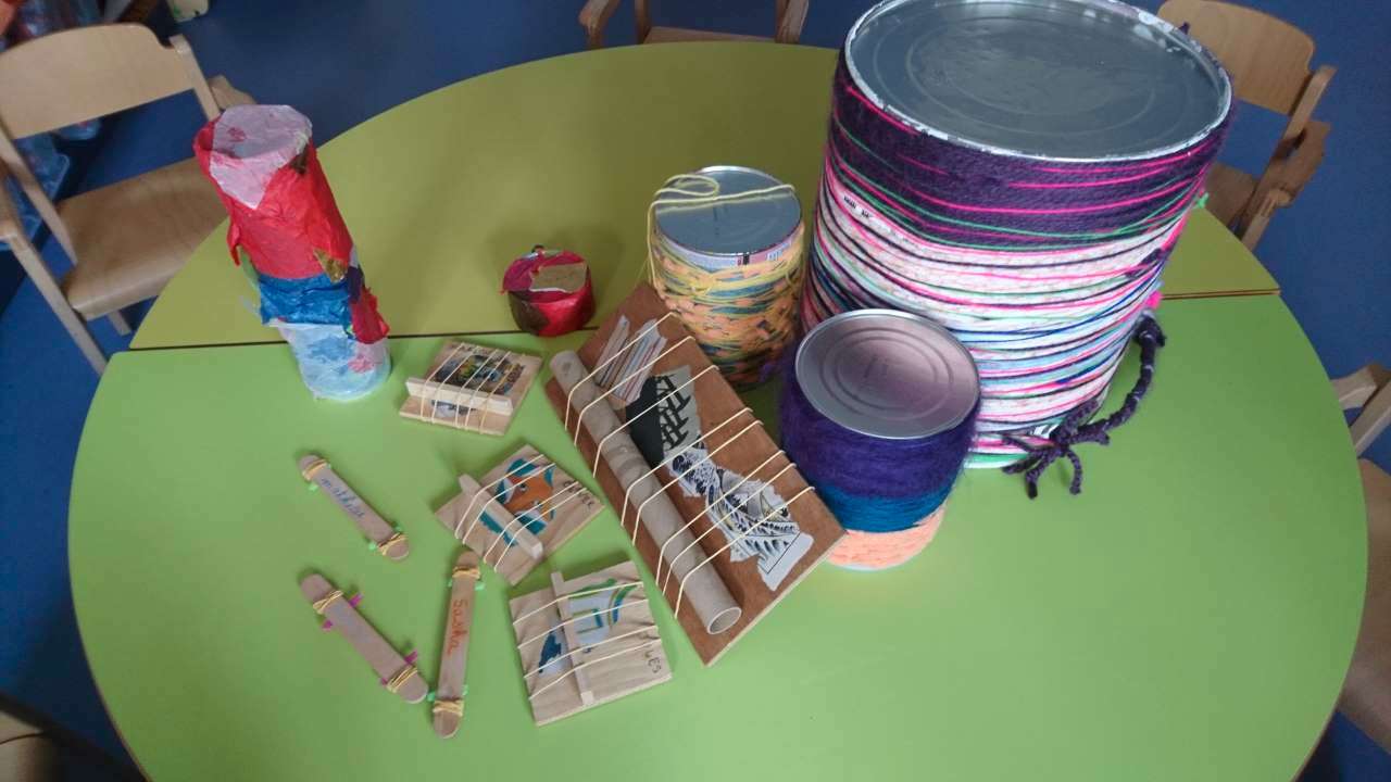 Partant de bonnes expériences que nous avons faites avec le recyclage, nous souhaitons orienter l’imaginaire créatif des enfants sur la fabrication d’instruments de musique en utilisant des matériaux de récupération (il peut s’agir de recyclage de déchets (bouteilles plastiques, boites en carton, capsules…) mais aussi de matériaux récoltés dans la nature (feuilles, branches, pierres, écorces…)