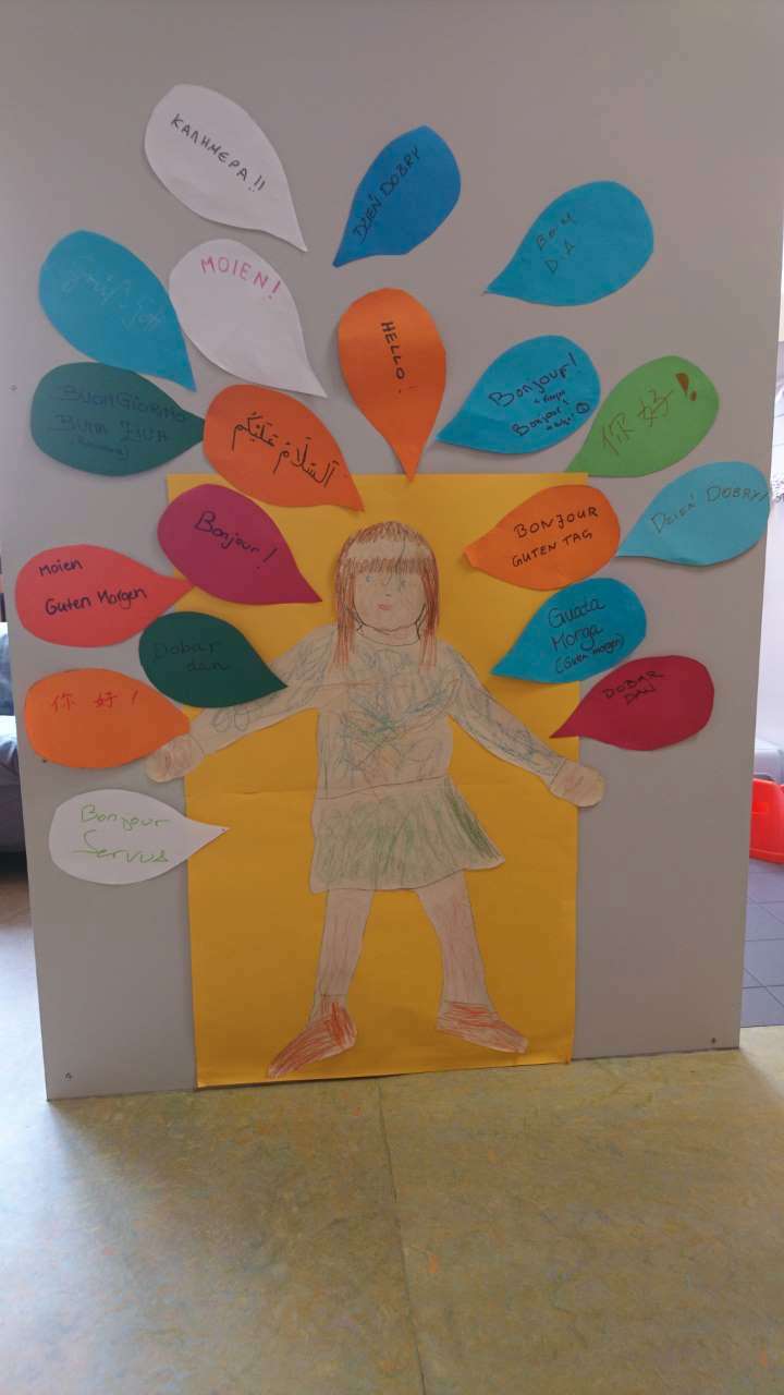 | Participation active des enfants/parents | Les parents ont écrit "bonjour" dans les langues parlées chez eux sur des "bulles" affichées dans notre hall d'entrée. |